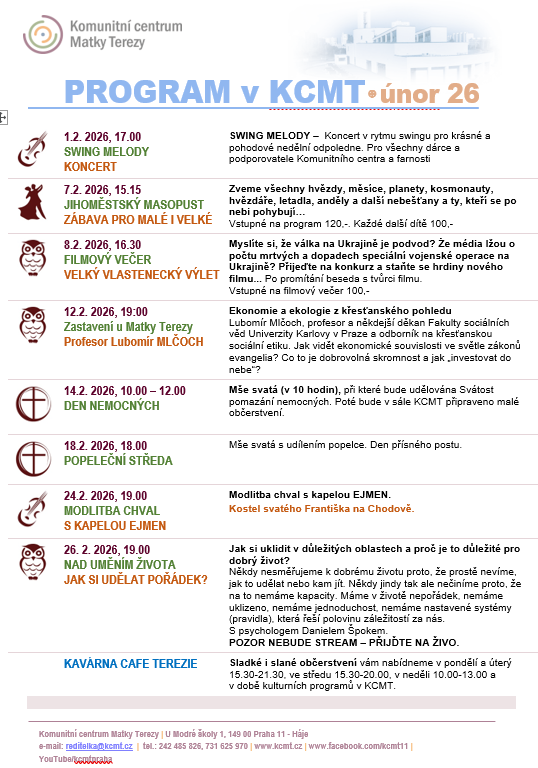 Nahlédněte do únorového programu KCMT. Detaily k jednotlivým akcím se vám rozbrazí po rozkliknutí políčka "AKCE" vpravo nad kalendářem.